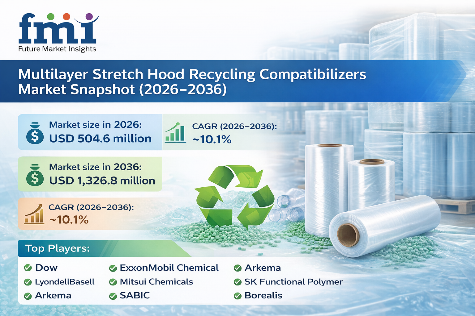 NEWARK, DE, UNITED STATES, March 16, 2026 /EINPresswire.com/ -- The global Multilayer Stretch Hood Recycling Compatibilizers Market is valued at USD 504.6 million in 2026 and is projected to reach USD 1,326.8 million by 2036, expanding at a CAGR of 10.1% from 2026 to 2036. Growth is driven by the rising need to recycle multilayer packaging films, increasing regulatory pressure on plastic waste, and the adoption of advanced reactive extrusion technologies that enable recovery of complex polymer structures.